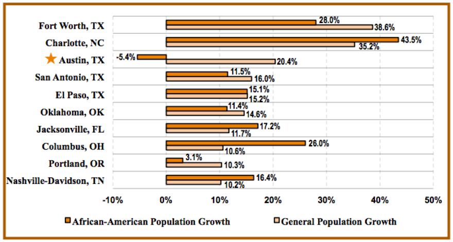The overall Austin population exploded between 2000 and 2010, growing by more than 20 percent. But a University of Texas study [PDF] finds that Austin was the only U.S. city experiencing double-digit population growth that saw its African-American population not only not keep pace, but actually decline.