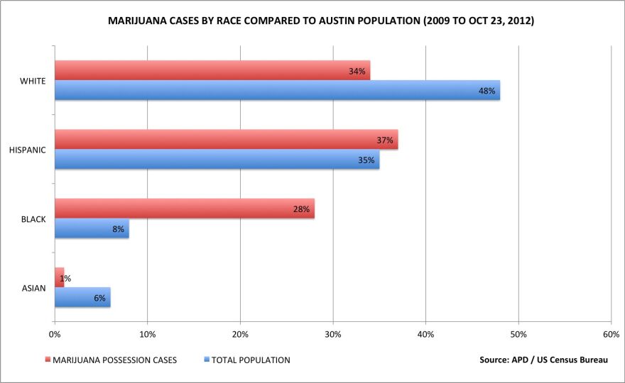 The Austin Police Department actually produces an annual racial profiling report. But it looks at traffic stops and searches, not marijuana cases. The last racial profiling report, released in March, says one in eight African-Americans was searched after being pulled over. That compares with one in 28 white drivers.