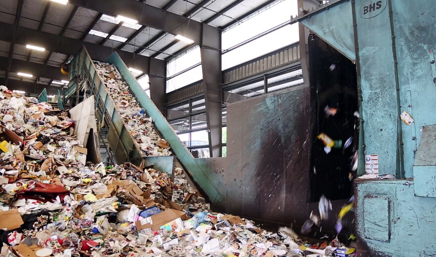 Some of it is very high tech. There are spots that use infrared lights to test the density of plastics and then jets of air blow them to different piles. But other parts on the line are more old fashioned. Like where lines of women sort items by hand and discard unusable things like pizza boxes.