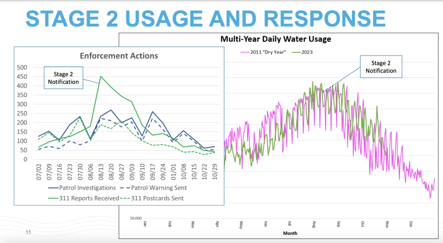 A graph shared at the meeting showed around 450 complaints filed with the city in the week after drought restrictions were announced, up from under 200 filed during the first week of August. The city appears to have received more than 300 complaints each week into early September.