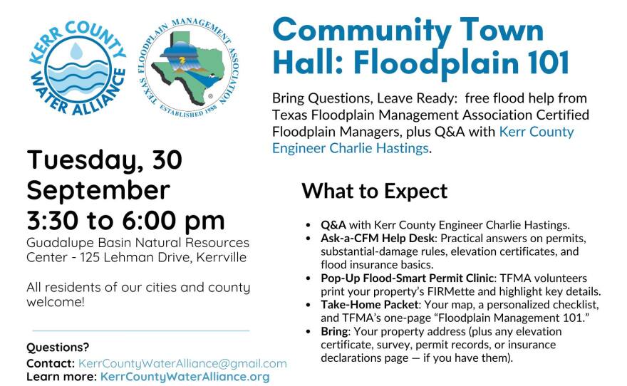 Kerr County commissioners will host a town hall meeting in Center Point on Wednesday, Oct. 8, at Center Point Elementary to discuss a flood event summary, Camp Mystic, and rebuilding efforts.